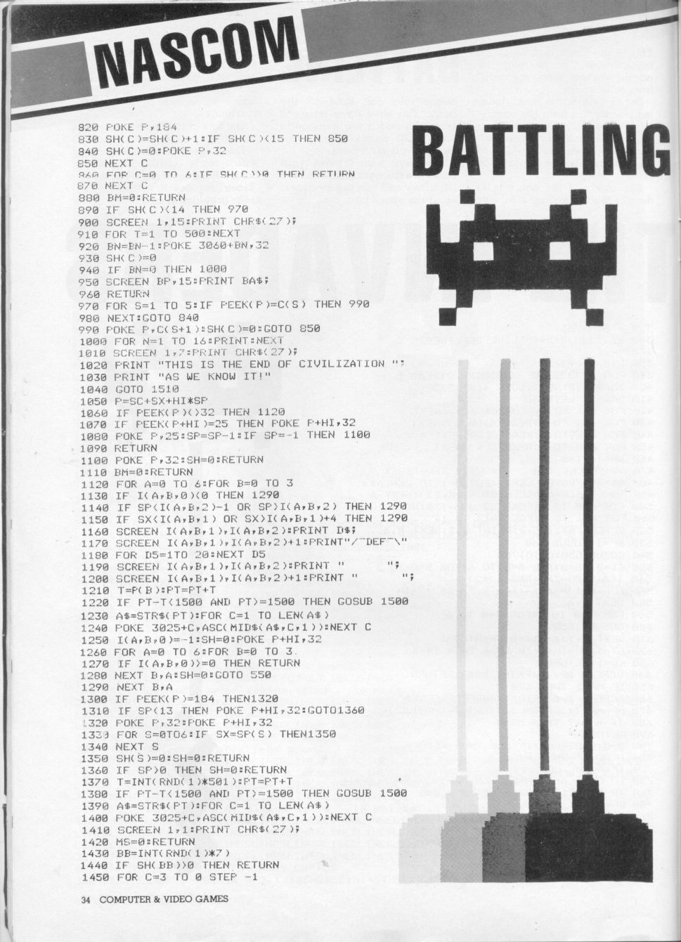 However thanks to CP/M emulators and vnascom I have been able to re-convert this game back into the Nascom 2 MBASIC version. I can't guarantee that I haven't made any typos in this version given that it has been ported to and from CP/M but it seems to run just fine in vnascom. I hope that it is of some interest and include it here."